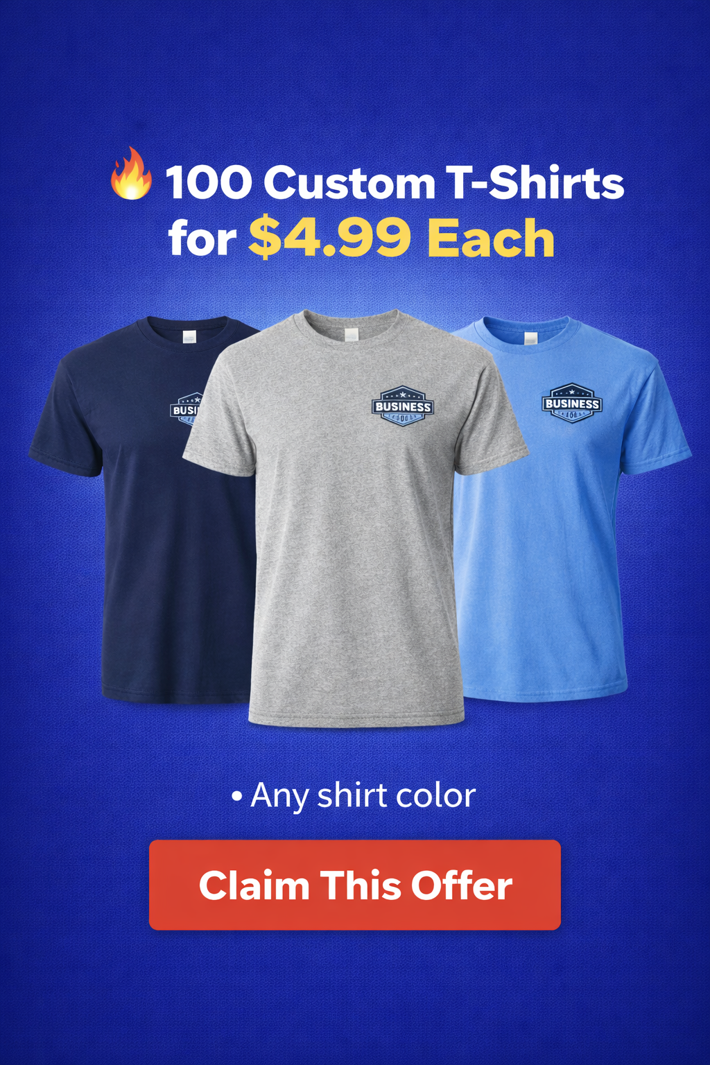 $4.99 per shirt with a minimum order of 100 pieces.
